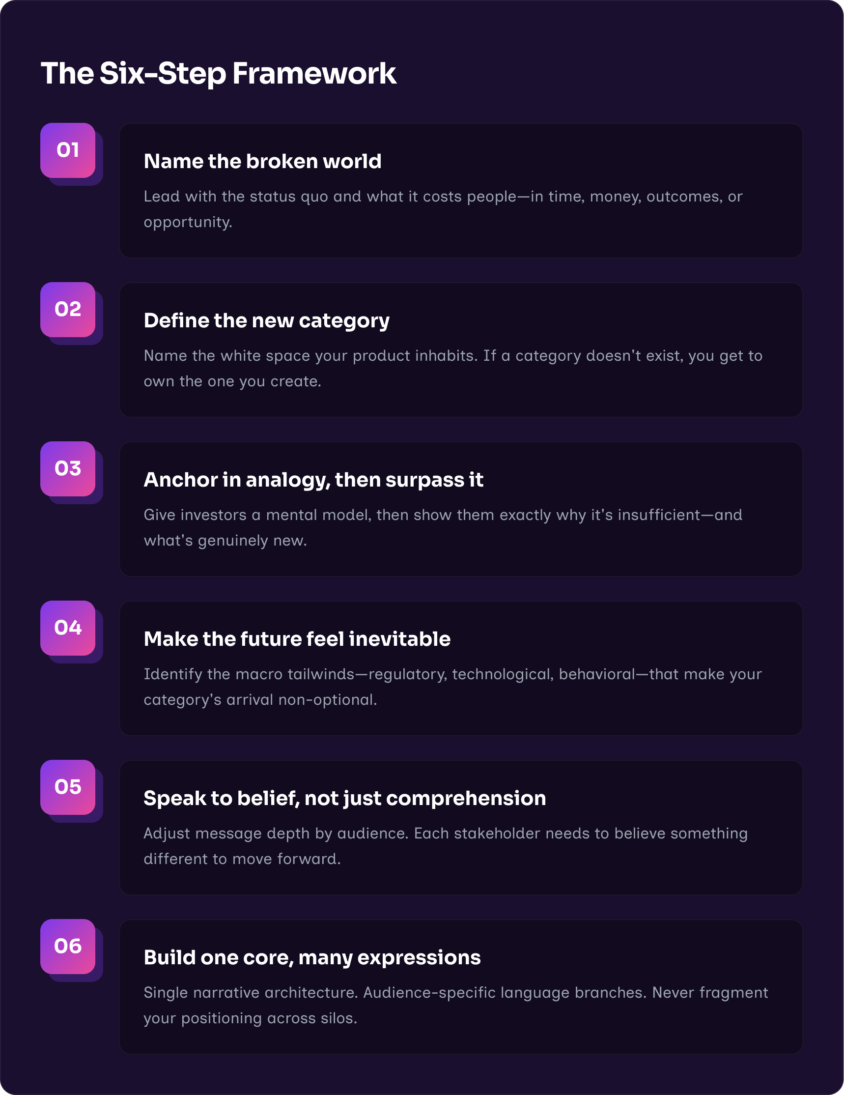 Category creation begins with problem definition. Before you introduce your technology, establish shared language around the problem it solves. The more precisely you can describe what's broken—in terms your audience already feels—the more inevitable your solution appears. This is as true in a fundraising pitch as it is on a product landing page.