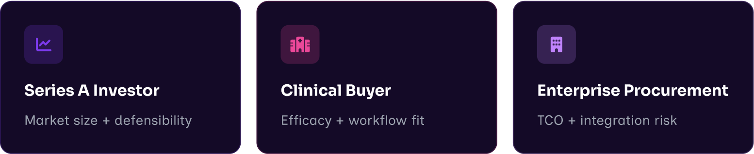 Not every audience needs to understand your technology at the same depth. Map out what each key stakeholder needs to believe (not understand) to take the next step. A Series A investor needs to believe in the market size and your defensibility. A clinical buyer needs to believe in efficacy and workflow fit. An enterprise procurement team needs to believe in TCO and integration risk. Build your messaging to create belief at the right level for each audience.